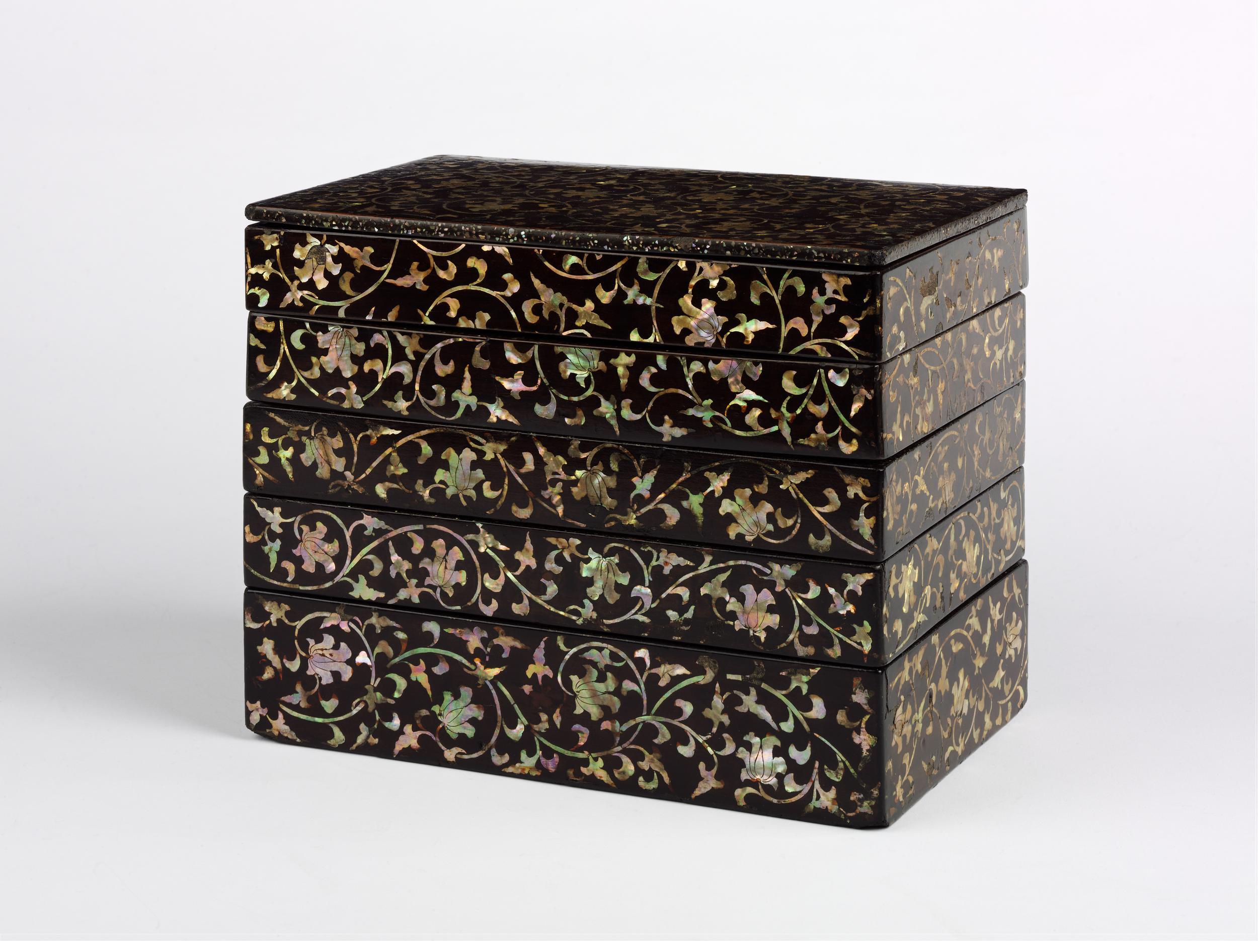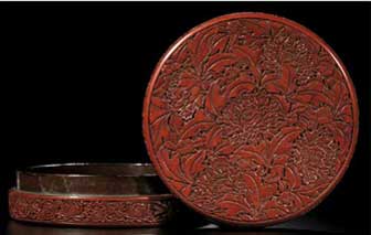 Antique lacquerware boxes can sometimes be inlaid with substances such as mother of pearl or it can sometimes be carved as in the image of the red cinnibar lacquerware box of the Yongle period.